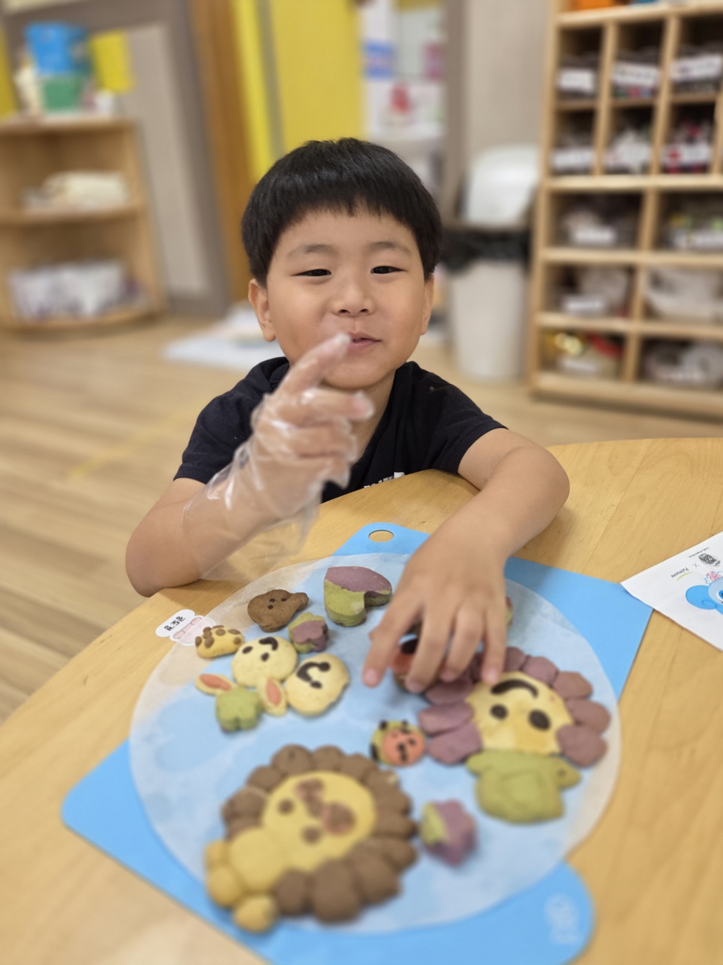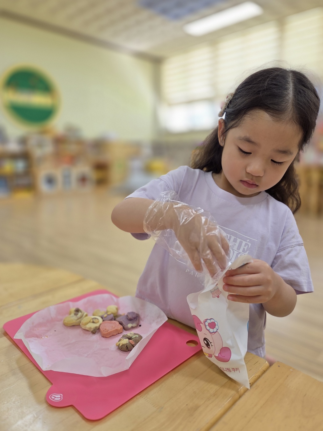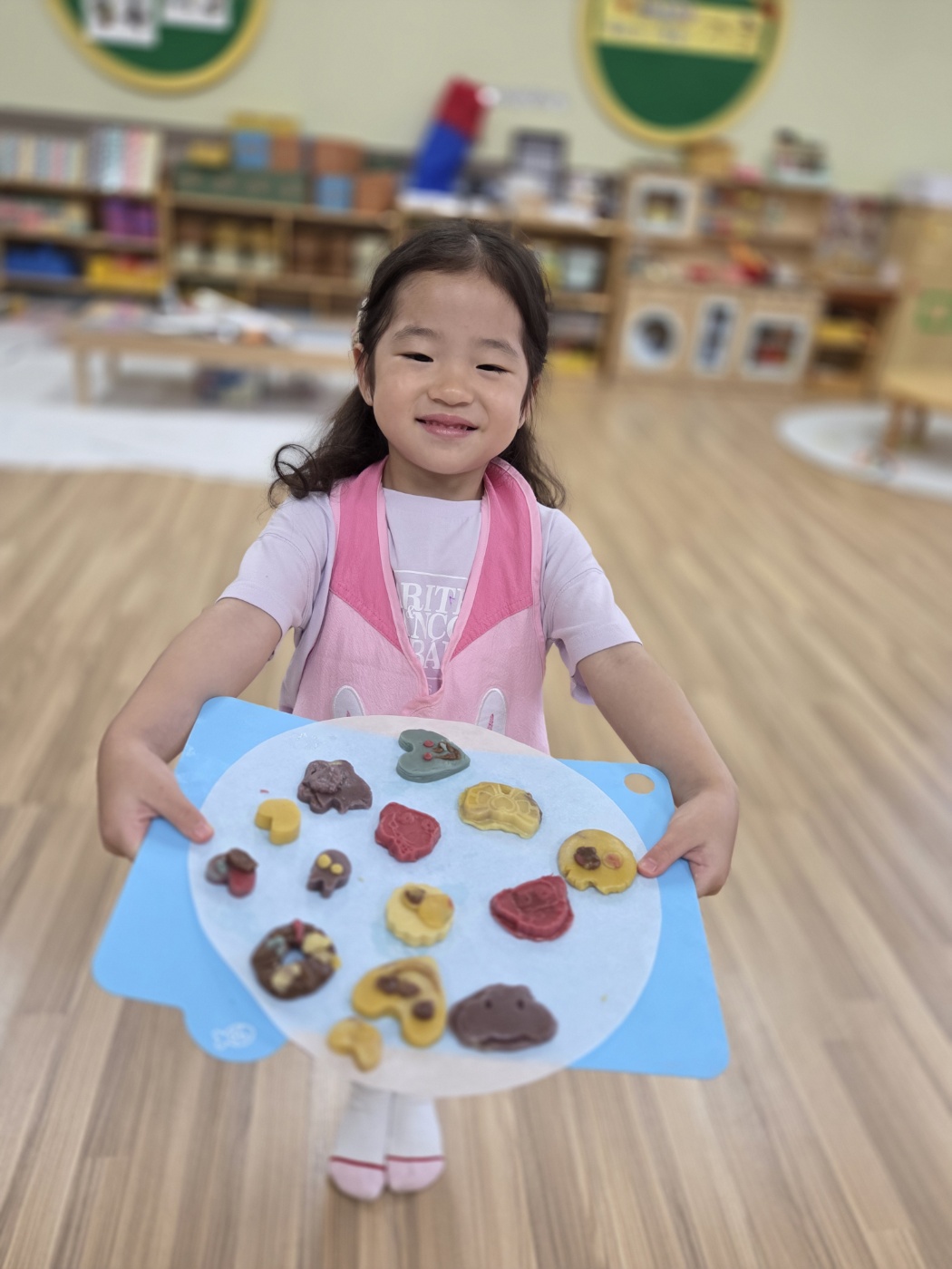 오늘 방과후과정에서는 달콤한 향기가 솔솔 퍼지는 쿠키 만들기 활동을 했습니다. 조물조물 즐겁게 반죽하고, 모양틀로 꾹꾹 찍어낸 후 귀여운 동물 모양으로 하나하나 정성스럽게 꾸며보았어요. 마치 파티쉐 3년 차 못지않은 솜씨로 동물들의 얼굴을 그려내는 아이들의 모습이 참 대견했습니다. 노릇노릇 맛있게 구워진 쿠키는 늘 우리 유치원 친구들을 따뜻하게 보살펴주시는 행정실 가족들께 정성껏 배달했답니다. '나누면 두 배가 되고, 베풀면 마음이 자란다'는 것을 자연스럽게 배우며, 따뜻한 마음과 소중한 나눔의 기쁨을 함께 느낀 시간이었습니다.