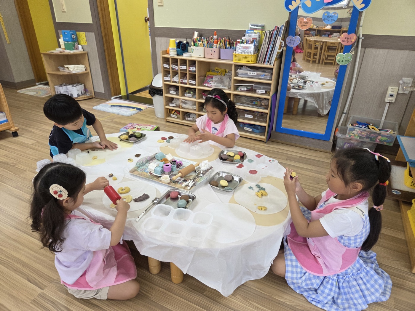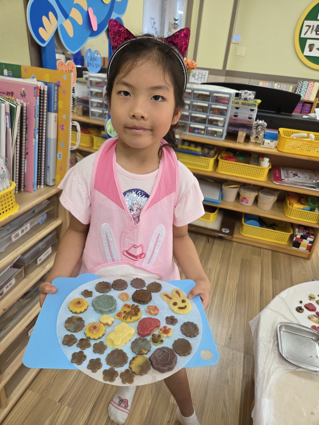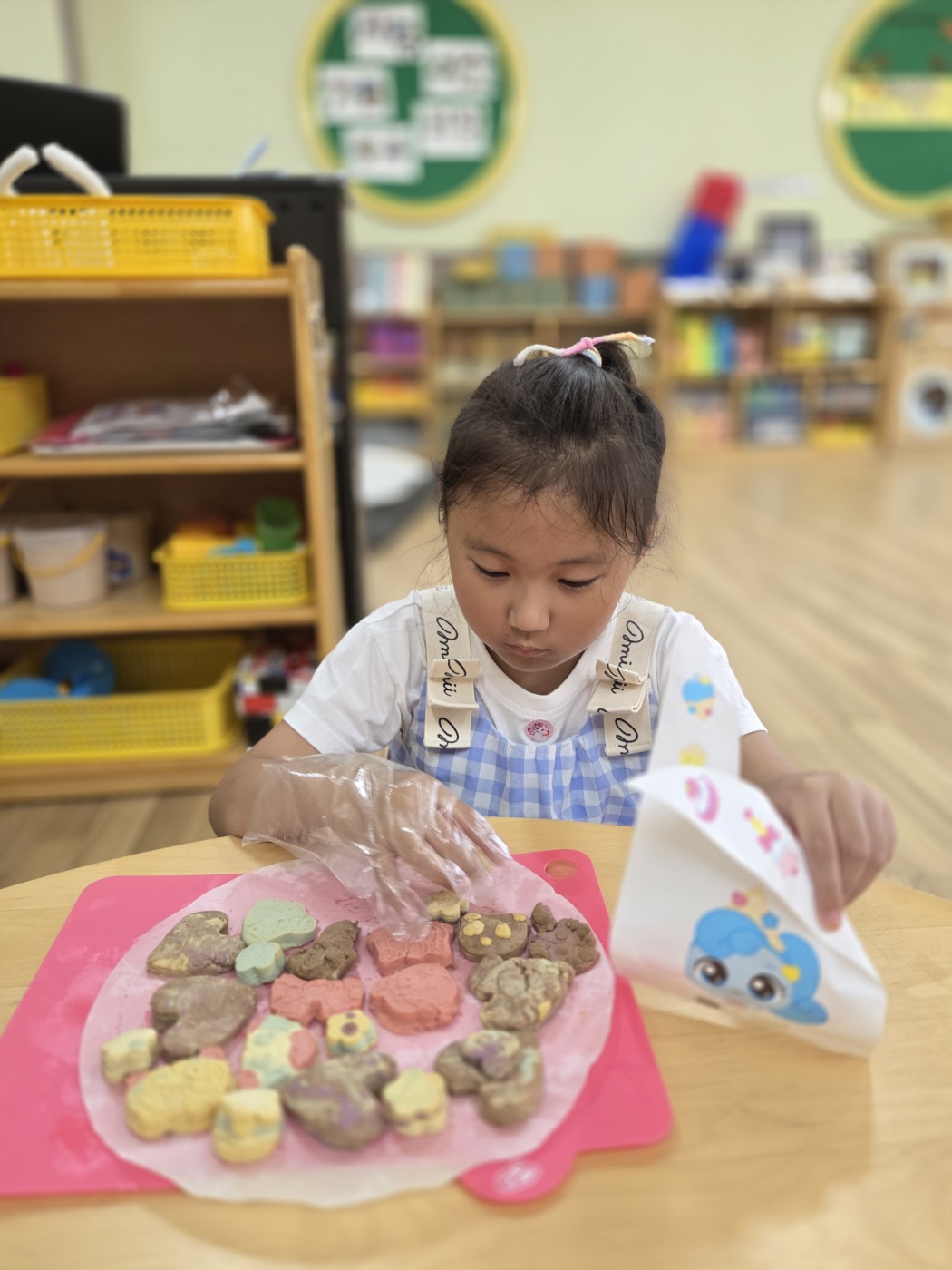 오늘 방과후과정에서는 달콤한 향기가 솔솔 퍼지는 쿠키 만들기 활동을 했습니다. 조물조물 즐겁게 반죽하고, 모양틀로 꾹꾹 찍어낸 후 귀여운 동물 모양으로 하나하나 정성스럽게 꾸며보았어요. 마치 파티쉐 3년 차 못지않은 솜씨로 동물들의 얼굴을 그려내는 아이들의 모습이 참 대견했습니다. 노릇노릇 맛있게 구워진 쿠키는 늘 우리 유치원 친구들을 따뜻하게 보살펴주시는 행정실 가족들께 정성껏 배달했답니다. '나누면 두 배가 되고, 베풀면 마음이 자란다'는 것을 자연스럽게 배우며, 따뜻한 마음과 소중한 나눔의 기쁨을 함께 느낀 시간이었습니다.
