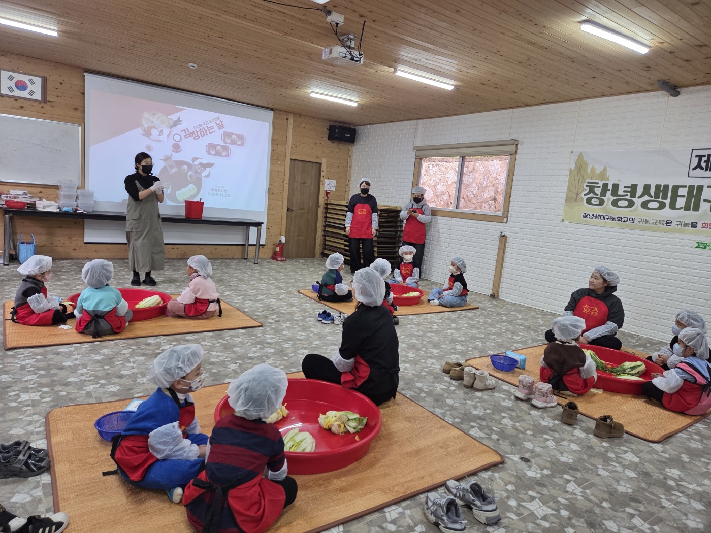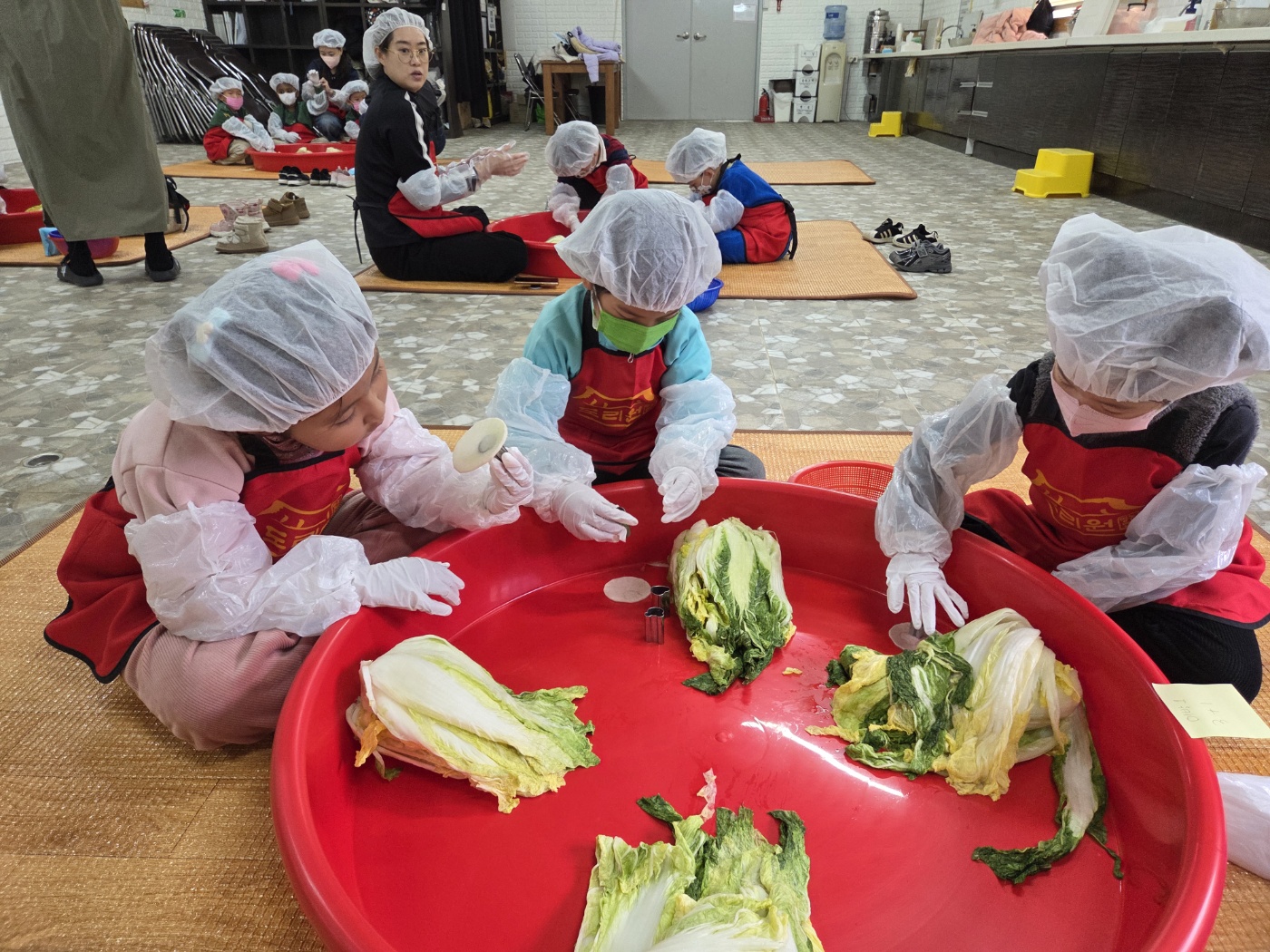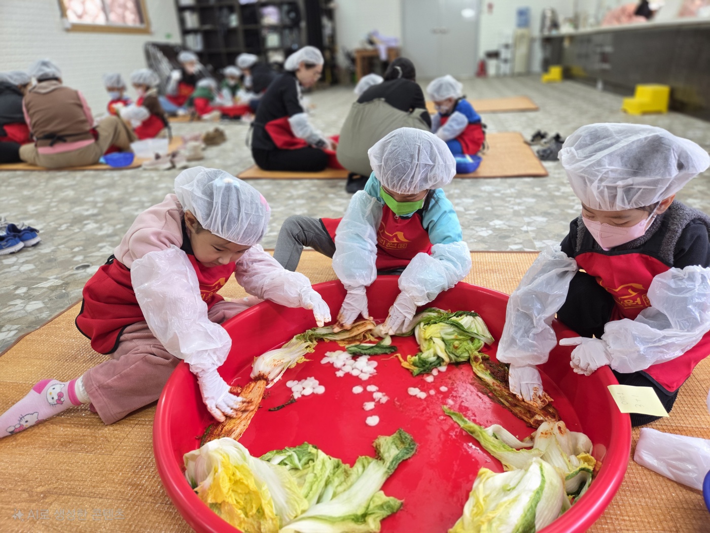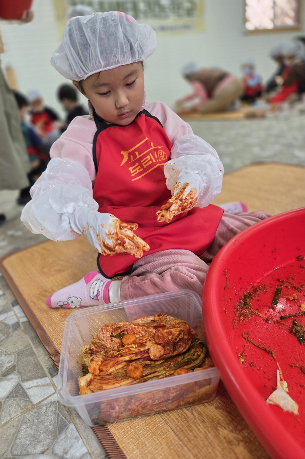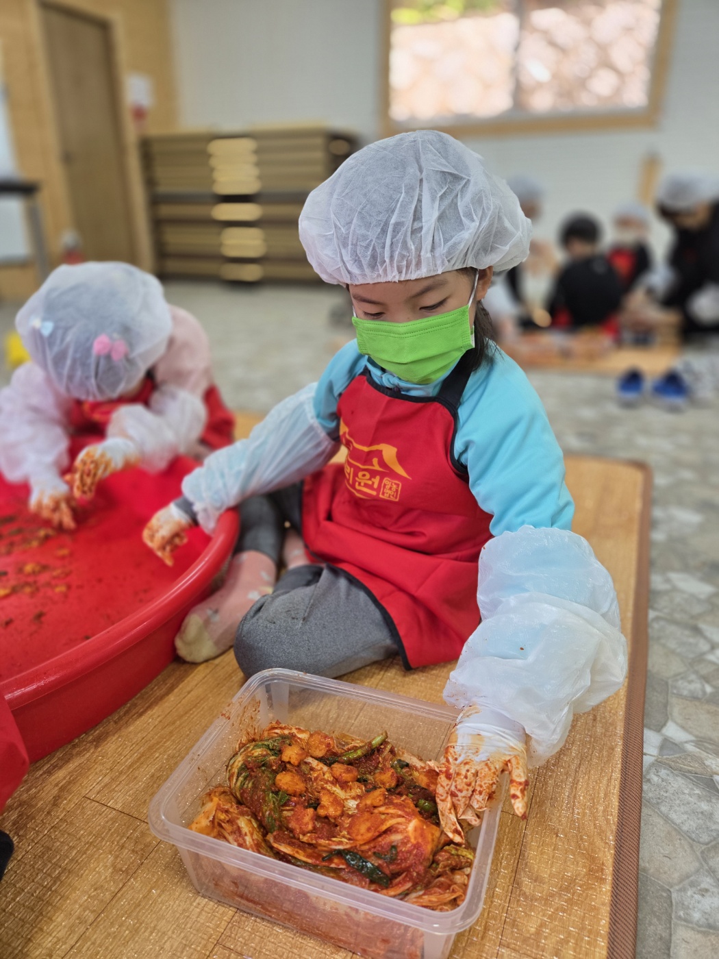 겨울을 앞두고 아이들과 함께 우리나라 전통 음식인 김장 체험을 진행했어요. 김장은 겨울에 만들어 1년 동안 먹는 음식으로, 예전에는 장독대에 보관하며 가족들의 건강을 책임졌던 소중한 저장 음식이라는 것을 알게되 었어요. 아이들은 위생모와 앞치마를 착용하고, 커다란 고무대야 속 배추에 양념을 바르며 “우리 가족 김치예요!” 하며 즐겁게 김치를 담갔답니다. 모양틀로 무도 찍어보고, 배추잎에 양념을 바르며 김치가 만들어지는 과정을 직접 경험할 수 있었습니다. 직접 만든 김치를 들고 환하게 웃는 아이들의 모습에서 전통음식에 대한 흥미와 자부심이 느껴졌습니다.